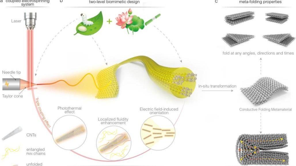 2025.10.23吴彤研究员团队变革百年电纺技术,创建激光诱导仿生方法,实现折叠电子超材料的突破,成果发表于PNAS