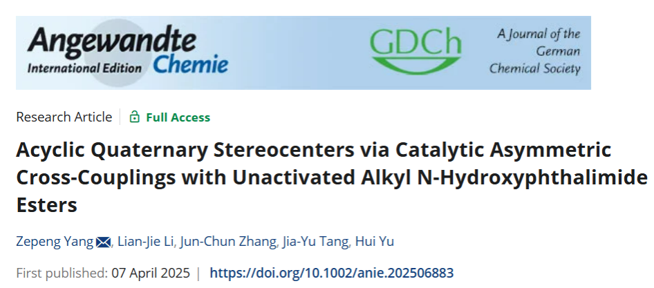 近日,同济大学杨泽鹏课题组基于丰产金属催化不对称偶联反应的研究兴趣(J. Am. Chem. Soc. 2024, 146, 9404−9412; Nat. Commun. 2024, 15, 2733),开发了一种基于光氧化还原/铁/手性路易斯酸三重协同催化的策略,成功构建了一系列含链状季碳手性中心的化合物。相关研究成果“Acyclic Quaternary Stereocenters via Catalytic Asymmetric Cross-Couplings with Unactivated Alkyl N-Hydroxyphthalimide Esters”在线发表于化学领域知名学术期刊《德国应用化学》(Angewandte Chemie International Edition)。