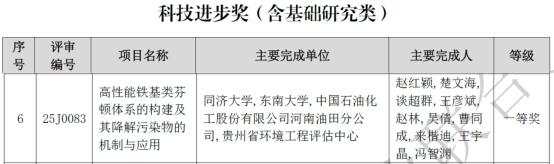 近日,2025中国石油和化学工业联合会科技奖励大会在北京召开,同济大学化学科学与工程学院赵红颖教授团队牵头的项目《高性能铁基类芬顿体系的构建及其降解污染物的机制与应用》荣获科技进步奖一等奖。