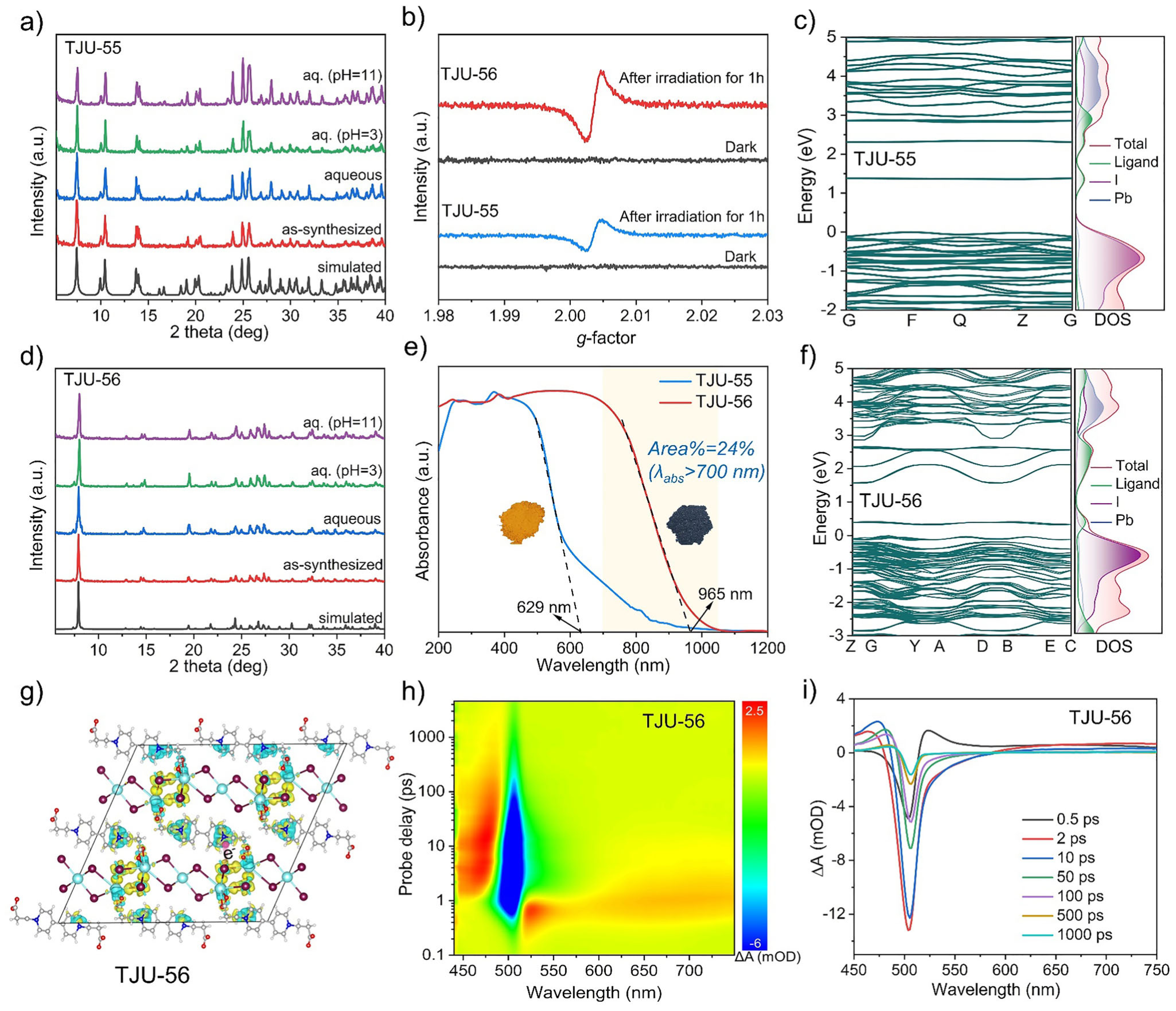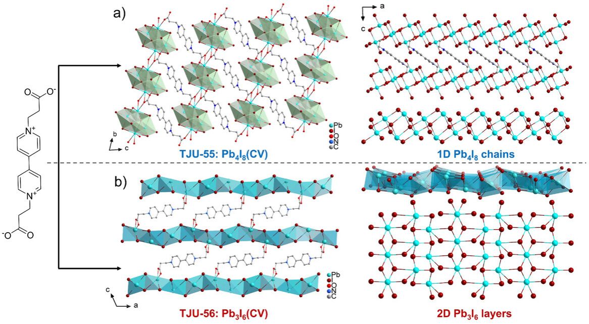 同济大学费泓涵教授团队近年来围绕配位组装高稳定卤化铅材料开展了系统性研究。团队突破传统思路,采用有机阴离子型配体替代常规有机胺阳离子,通过配位组装策略显著提升了这类材料的晶格能和稳定性,使其在水环境下仍能保持稳定存在(Acc. Chem. Res. 2023, 56, 452)。然而,前期工作中使用传统脂肪族羧酸配体的卤化铅材料存在带隙较宽、光吸收范围有限、催化效率低的问题,尚无法实现对近红外光的有效利用。相较于传统的饱和羧酸配体,缺电子π共轭自由基配体(如紫精基团)作为一类功能化光催化配体,能够有效克服前者的本征劣势。其最高占据分子轨道中的未配对电子,利于形成长寿命的电荷分离态,进而引发高效的光诱导电子转移,协同实现宽光谱吸收、激发态寿命延长与电荷分离效率提升。因此,将缺电子紫精配体单元与富电子碘化铅光吸收活性单元通过配位组装策略构筑紫精基卤化铅框架,有望实现高效的近红外驱动光催化CO2还原。
