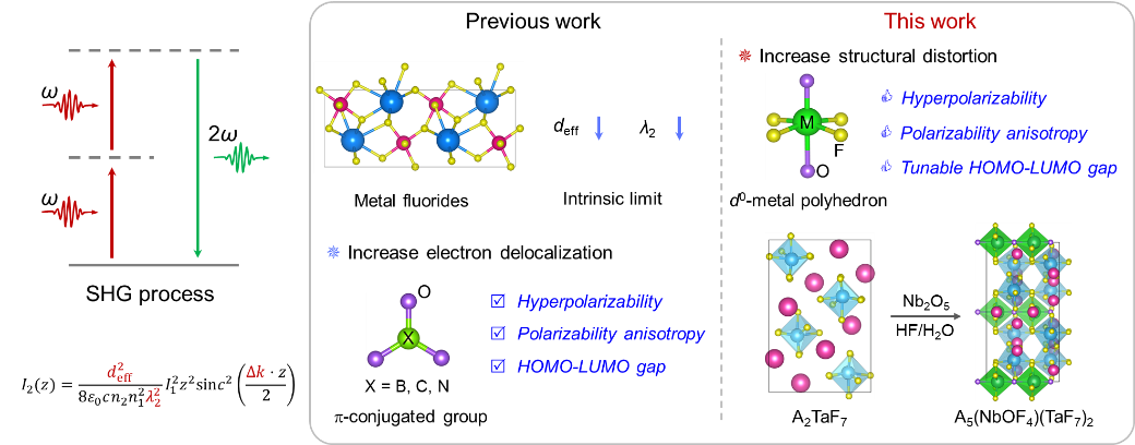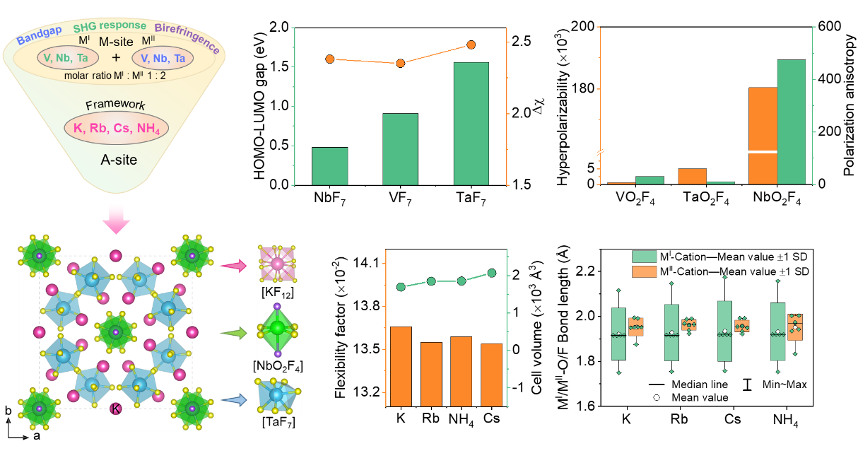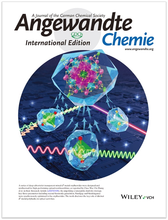 近日,欧洲科学院院士、德国国家工程院院士、同济大学化学科学与工程学院张弛教授研究团队在混合d0过渡金属二阶非线性光学晶体材料研究中再获重要进展,实现了二阶非线性光学晶体材料深紫外透明度/非线性光学性能权衡的新突破。我校化学科学与工程研究团队与中科院北京理化技术研究所和澳大利亚国立大学等单位研究团队紧密合作,利用第一性原理计算对过渡金属氟化基元进行筛选,采用协同双位点策略,合成了首例深紫外透过且能够通过四次谐波产生输出266 nm倍频光的混合d0过渡金属材料A5(NbOF4)(TaF7)2 (A = K, Rb, Cs, NH4),探讨并阐明了受控氟化基元对晶体材料光学性能的调控机制。相关成果“Breaking the Deep-UV Transparency/Optical Nonlinearity Trade-Off: Three-Parameter Optimization in Oxyfluorides by Tailoring d0-Metal Incorporation” (打破深紫外透明度/非线性光学的权衡:通过调控d0金属掺入优化氧氟化物的三个参数)日前以全文(Research Article)的形式发表于国际化学、材料顶级权威学术期刊《德国应用化学》(Angewandte Chemie International Edition, 2025, 64, e202513438),并被编辑委员会遴选推荐为当期的封面文章(Inside Front Cover)和热点论文(HOT Paper)。