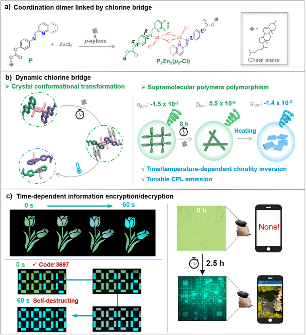 图1 a)基于氯桥键的手性二聚体配合物分子结构;b)构象转变及氯桥键断裂引发两次手性反转与CPL发射波长调控的机理示意图;c)时间响应型发光与CPL信号反转在信息加密中的原理示意图