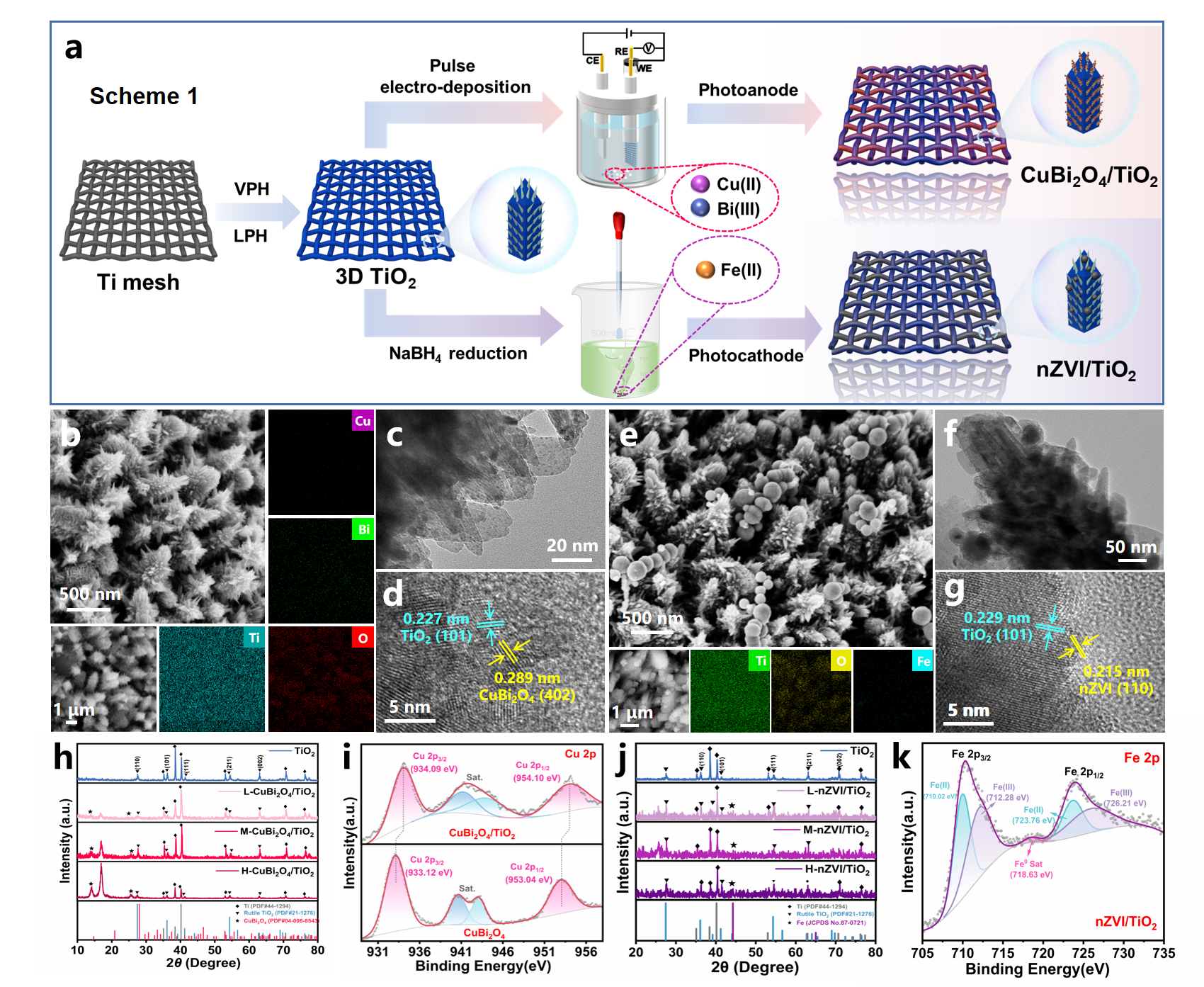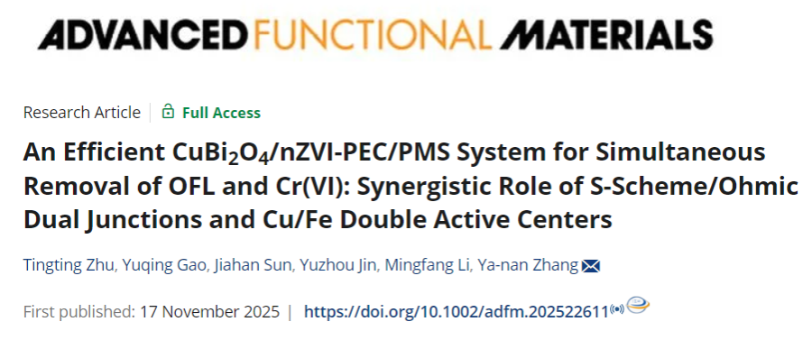 同济大学化学科学与工程学院长聘副教授张亚男长期致力于复杂水体污染物的高效去除相关研究。研究团队近期采用“S型/欧姆双异质结”与“Cu/Fe双金属中心”协同策略,成功制备了先进的CuBi2O4/TiO2光阳极和nZVI/TiO2光阴极,并通过光电催化(PEC)耦合过氧单硫酸盐(PMS),构建了高效的CuBi2O4/nZVI-PEC/PMS体系,实现了对OFL和Cr(VI)的高效同步去除。相关研究成果以“An efficient CuBi2O4/nZVI-PEC/PMS system for simultaneous removal of OFL and Cr(VI): Synergistic role of S-Scheme/Ohmic dual junctions and Cu/Fe double active centers”为题发表于国际知名期刊《先进功能材料》(Advanced Functional Materials)。
