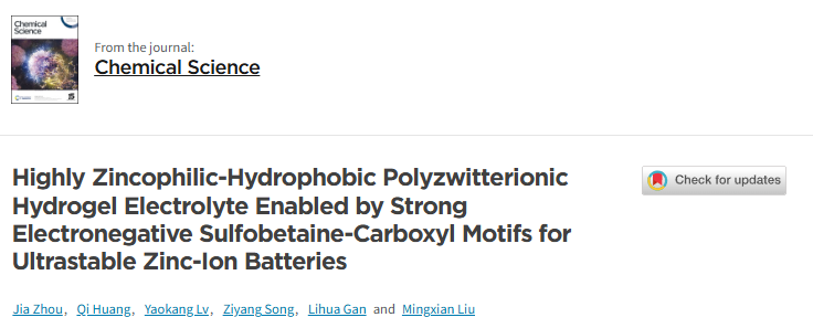 我院刘明贤教授团队长期致力于高效储能材料研究并应用于新能源电池,研究团队近期设计了高度亲锌-疏水聚两性离子水凝胶电解质,有效抑制了锌枝晶生长和腐蚀反应,构建了超稳定的水系锌离子电池。相关研究成果以Highly Zincophilic-Hydrophobic Polyzwitterionic Hydrogel Electrolyte Enabled by Strong Electronegative Sulfobetaine-Carboxyl Motifs for Ultrastable Zinc-Ion Batteries为题发表于化学领域国际知名期刊《化学科学》(Chemical Science)。