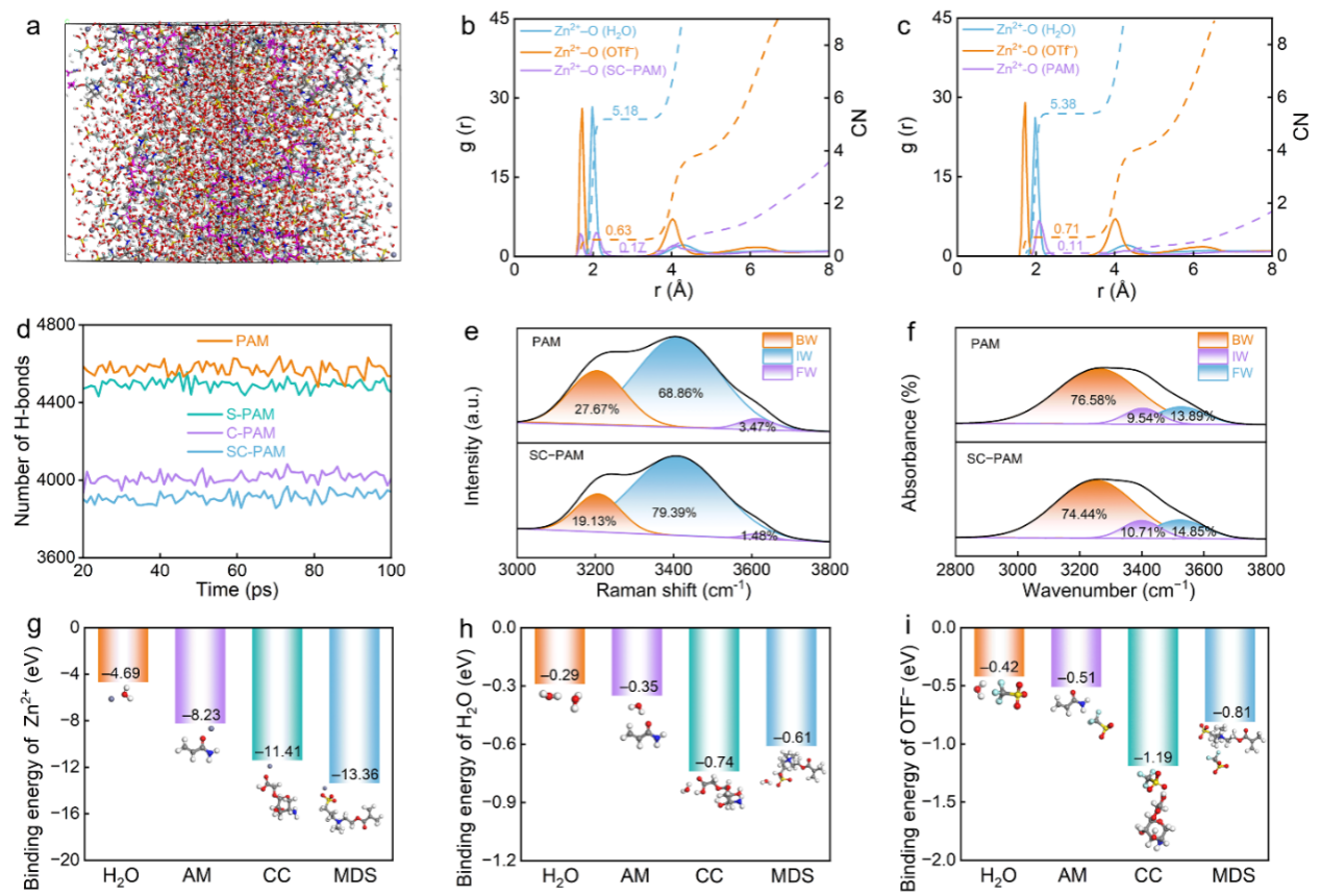 理论计算和光谱表征表明,SC-PAM中亲锌磺酸根基团有利于Zn2+快速传导;其强负电性羧基基团通过氢键作用有效锚定自由水分子,打破了游离H2O分子间的内在氢键作用,优化了Zn2+离子的溶剂化结构。