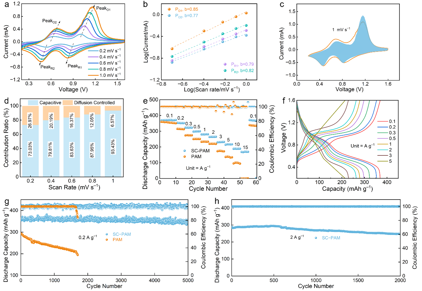 SC-PAM水凝胶电解质用于钒基锌离子电池时,表现出高比容量(372 mAh g−1)和高稳定性(5000 次循环)。这项研究工作为亲锌-疏水聚两性离子水凝胶电解质的结构设计和高性能锌离子电池的构筑提供了新的视角。
