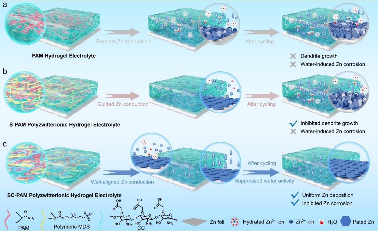以丙烯酰胺为基体,磺基甜菜碱和羧基化壳聚糖交联形成聚两性离子水凝胶电解质(SC-PAM),其亲锌磺酸根基团促进均匀Zn2+沉积,强负电性羧基基团通过氢键作用在锌负极表面形成疏水层,避免水腐蚀。