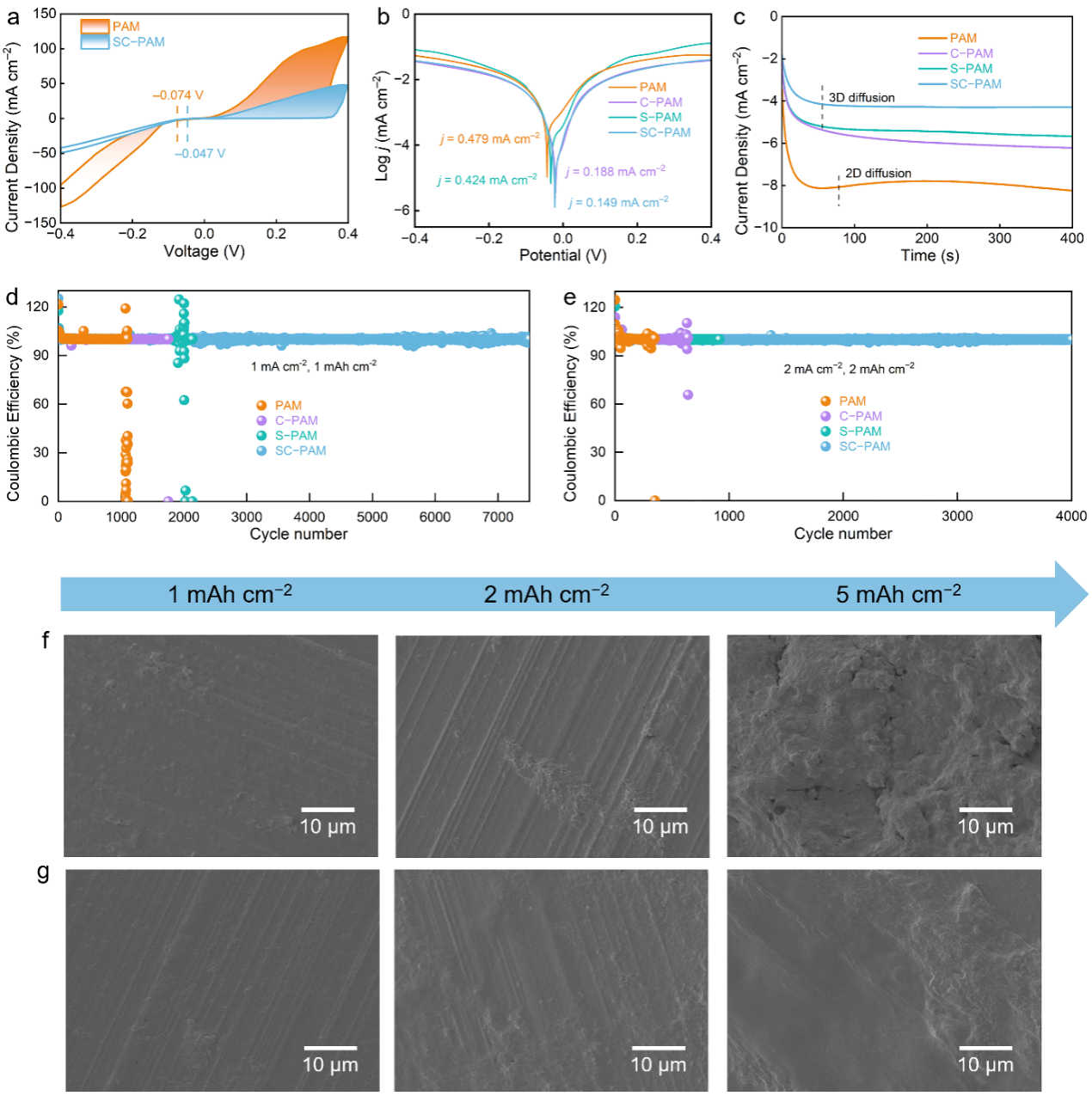 电化学研究和实验表征表明,SC-PAM水凝胶电解质赋予Zn||Cu电池高度可逆的沉积/剥离行为,在1 mA cm−2下循环7500次平均库仑效率达99.7%,实现了优异的循环稳定性。