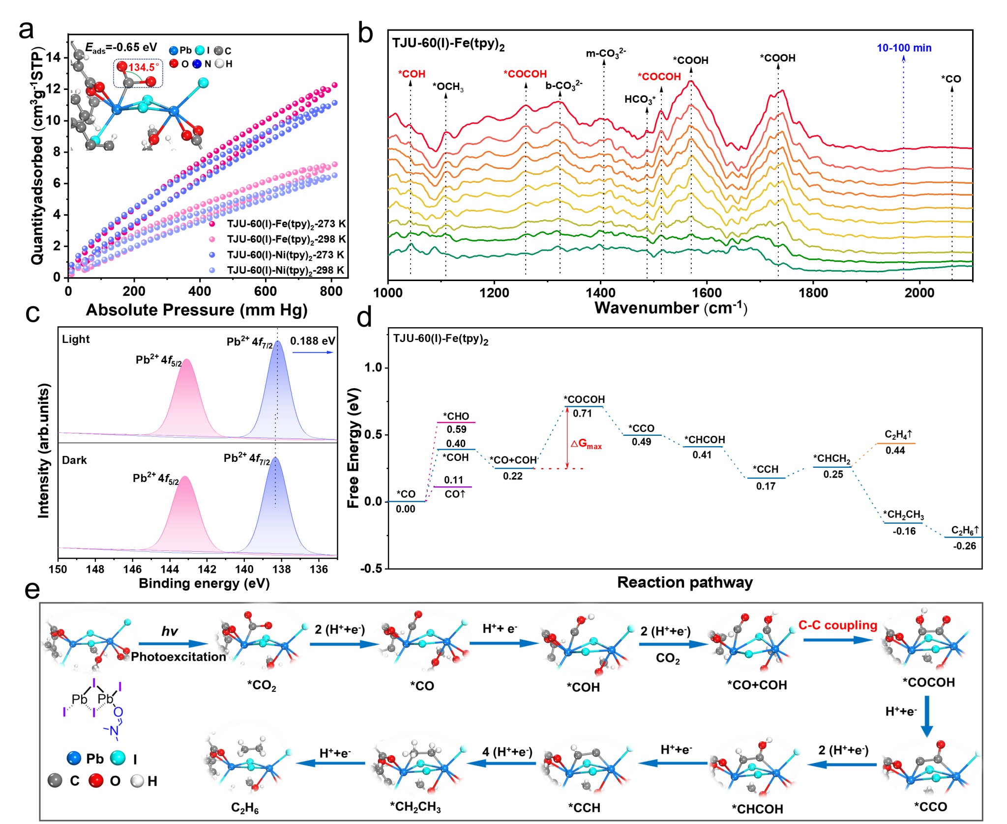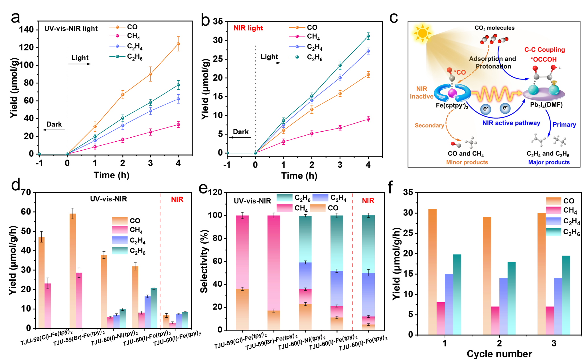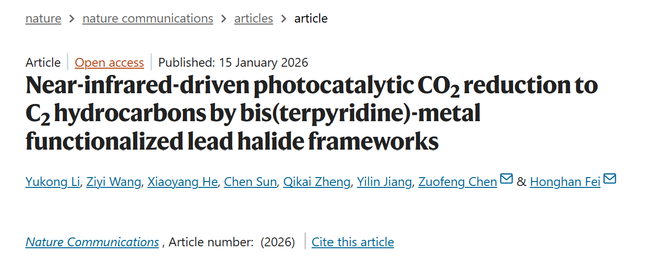 杂化卤化铅因其优异的光物理性质,在光催化CO2还原领域展现出巨大潜力。然而,开发兼具高本征稳定性与近红外吸收能力的单组分杂化卤化铅材料仍面临严峻挑战。为解决这一难题,我院费泓涵教授联合陈作锋教授团队,研究设计了九例双(三联吡啶)-金属配合物功能化的高稳定性卤化铅框架,其光吸收范围可延伸至1150 nm的近红外区域。其中碘化铅框架中的电荷极化活性位点可作为高效C–C偶联中心,在近红外驱动CO2光还原中实现了高达14.2 μmol g-1 h-1的C2烃类产物生成速率,电子选择性达86 %。该研究揭示了通过配位驱动组装高稳定卤化铅框架以实现近红外驱动人工光合作用的潜力。相关成果以“Near-Infrared-Driven Photocatalytic CO2 Reduction to C2 Hydrocarbons by Bis(terpyridine)-Metal Functionalized Lead Halide Frameworks”为题,近日在线发表于《Nature Communications》。