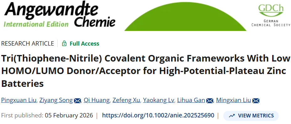 我院甘礼华教授、刘明贤教授团队长期致力于高效储能材料研究并应用于新能源电池,课题组近期设计了低HOMO/LUMO给体-受体的三噻吩-三氰基COFs正极材料,促进了低反应能垒的CF3SO3−/NH4+相反离子交替配位,揭示了p型三噻吩和n型三氰基单元的协同氧化还原电荷存储机制,有效解决了当前COFs高比容量和电压平台难以兼顾的难题,构建了高能量密度和长循环寿命的锌-有机电池。相关研究成果以Tri(Thiophene-Nitrile) Covalent Organic Frameworks With Low HOMO/LUMO Donor/Acceptor for High-Potential-Plateau Zinc Batteries为题发表于化学领域国际权威期刊《德国应用化学》(Angewandte Chemie International Edition)。