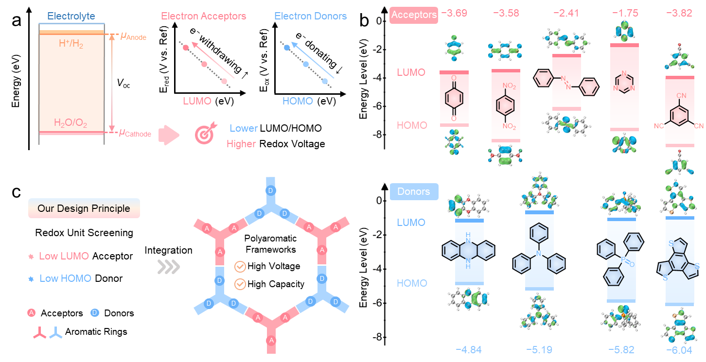研究表明,有机正极材料较低的最高占据分子轨道(HOMO)和最低未占据分子轨道(LUMO)能级会导致较高的氧化和还原电压平台。通过理论计算筛选了一系列高氧化还原活性的受体和给体单元,其中三噻吩和三氰基具有最低的HOMO和LUMO能量水平,有望实现较高的氧化还原电压平台。