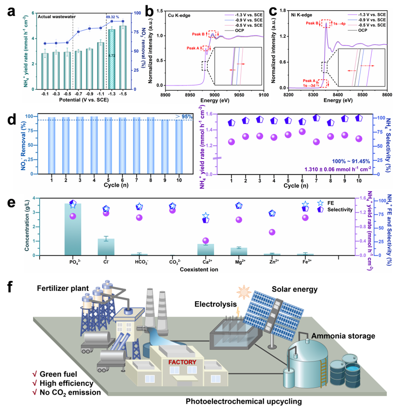该研究在实际化肥厂工业废水中的应用中展现出卓越性能:实现了90%的NO3−去除率和90%的NH3产物选择性,NH3产率高达4.72 mmol h−1 cm−2,并且在宽pH范围和不同浓度的阴/阳共存离子下具有很好的抗干扰性能。通过原位同步辐射载流子动态追踪研究证实了Cu和Ni的电荷转移过程,在电位驱动下Cu−Ov−Ni结构提供了稳定的Cu→Ni→N的电子轨道传输路径和级联催化位点。在连续10个催化反应循环中,NO3−去除率> 95%, NH3选择性> 91%, NH4+产率达到1.31 ± 0.06 mmol h−1 cm−2,通过实践验证了该技术在未来绿色能源自供给应用中具有很好的可推广性及环境修复的潜力。