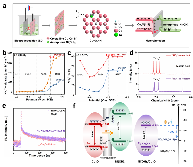 在这一研究中,研究团队创新性地采用点缺陷异质结与界面工程策略研制了一种由Cu−Ov−Ni键合的非晶/晶相异质结Ni(OH)2/Cu2O光电催化剂。研究表明,Ni(OH)2/Cu2O以高NH3产率(1316.1 μmol h−1 cm−2)实现了快速且完全的NO3−转化,并展现出稳定的法拉第效率(>99%)和高选择性(>97%),伴随着优异的正起始电位(0.322 V vs. RHE)。进一步研究表明,在不同反应电位下,光电作用模式从电助光催化转变为光助电催化,更高电位下呈现光电协同催化过程。载流子动力学分析阐明了Cu2O→Ni(OH)2的内建电场是诱导平均电子寿命延长和性能增强的原因之一,展现了约100%的光吸收效率和约90%的高电荷分离效率。而同位素追踪测试则证实了氮源与其主要产物。