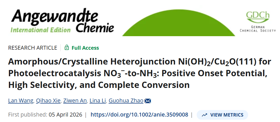 近日,同济大学化学科学与工程学院赵国华教授课题组提出了一种新型非晶/晶相异质结Ni(OH)2/Cu2O光电极在正起始电位下高选择性和硝酸盐向氨完全转化的反应策略。相关成果“Amorphous/Crystalline Heterojunction Ni(OH)2/Cu2O(111) for Photoelectrocatalysis NO3−-to-NH3: Positive Onset Potential, High Selectivity, and Complete Conversion”以Research Article形式发表于国际化学领域权威期刊《德国应用化学》(Angewandte Chemie International Edition, 2026, e3509008)。