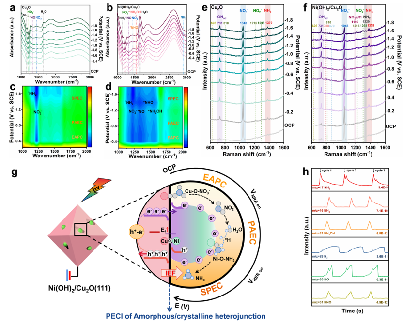 研究进一步利用原位红外光谱、原位拉曼光谱和原位在线质谱等揭示了反应路径与内在机制:Cu2O在低电位下产生载流子并促进决速步骤(Cu−O···*NO3−→Cu−O···*NO2−)进行,随后Ni(OH)2获得光生电子形成负电层,并在高电位下实现电子与*H的双重捕获,促进了质子化过程发生(Ni−O···*NO2−→Ni−O···*NO→Ni−O···*NOH→Ni−O···*NH2OH→Ni−O···*NH2→Ni−O···*NH3)。该研究明确了非均相异质结的光电催化界面调控催化剂的晶格配位与电子结构,为突破以水为介质的光电催化反应性能提供了新范式。